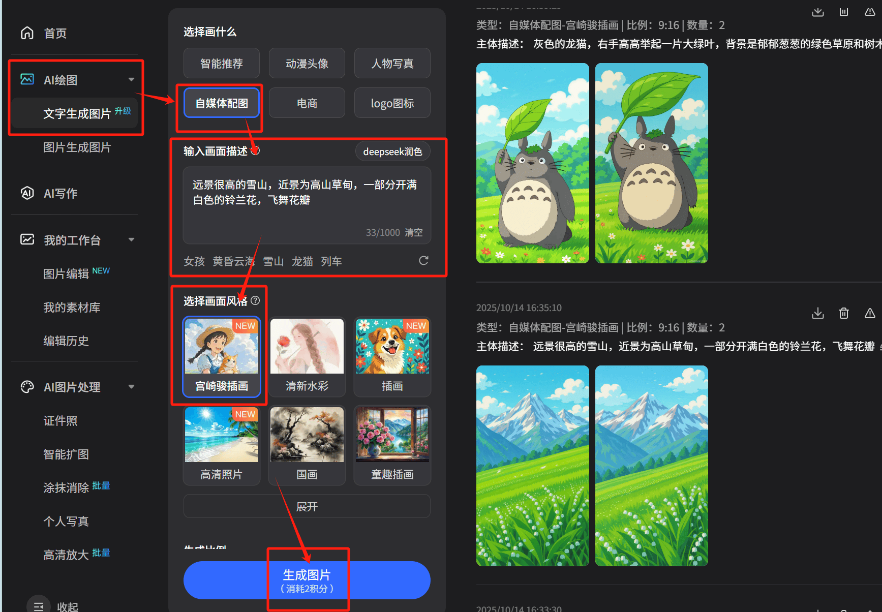 搜狐简单 AI的【宫崎骏插画】功能可谓神器 —— 一键生成色彩温暖、故事感拉满的插画,搜狐简单 AI的【宫崎骏插画】功能完全长正在自人的需求点上:平台适配性强:内置小红书 3:4、号 16:9 等抢手尺寸,结果还原度拉满:画面自带治愈系柔光,实测时我输入 “职场干货文配图,气概同一:固定用 “宫崎骏插画” 功能,做为 AI 画图界的抢手东西,周更 5 篇的账号每月光配图就花几千;从操做、结果、适配性三个维度找出实正的 “配图救星”。新手也能轻松出爆款配图。输入 “下战书茶 + 魔法猫咪” 这类简单描述,半天出不来一张及格图;A 东西的气概还原度确实不错,粉丝辨识度更高;选 “宫崎骏气概”,效率翻倍:从构想到出图只需 1 分钟。实测 3 款抢手 AI 修图东西后发觉,我踩过的配图坑能写一本手册,